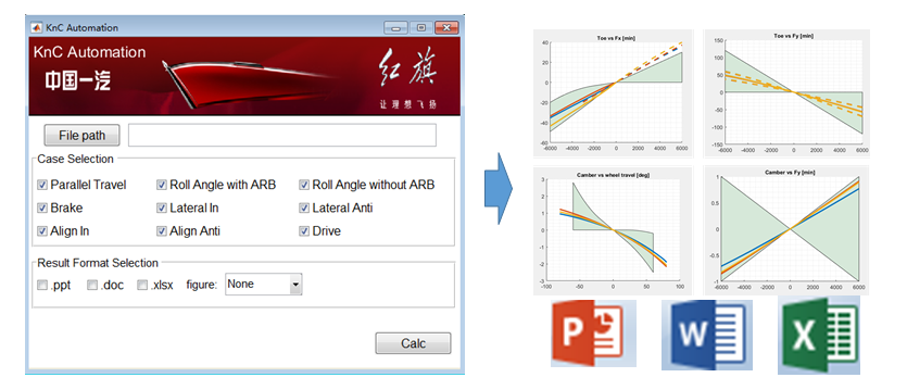 K&C Auto 工具包含 K&C 仿真、结果处理及报告输出三大功能模块,可支撑 K&C 性能开发全流程: