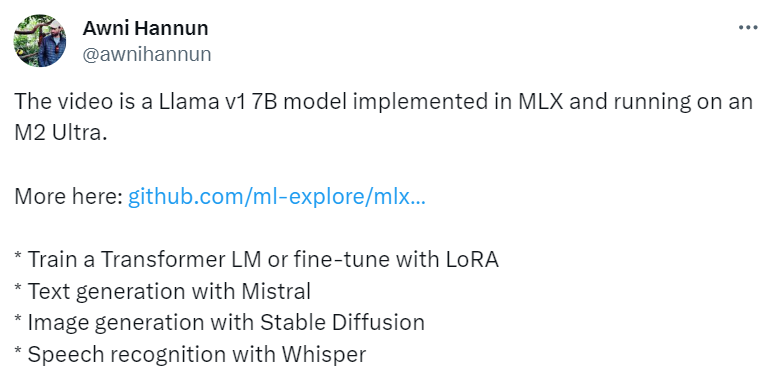 MLX 项目贡献者之一、Apple 机器学习研究团队(MLR)研究科学家 Awni Hannun 展示了一段使用 MLX 框架实现 Llama 7B 并在 M2 Ultra 上运行的视频。