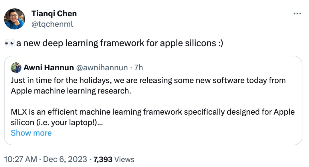MLX快速引起了机器学习研究人员的关注。TVM,MXNET和XGBoost的作者,CMU助理教授以及OctoML CTO的陈天奇转推表示:“苹果芯片又有新的深度学习框架了。”