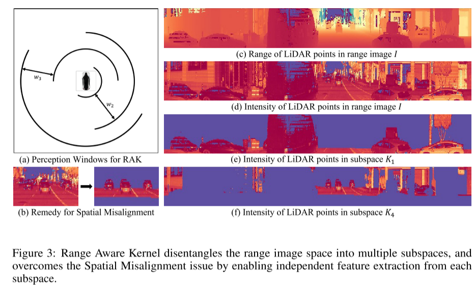 图 3:Range Aware Kernel 将 range image 空间分解为多个子空间,并通过从每个子空间提取独立的特征来克服空间错位问题(Spatial Misalignment issue)。