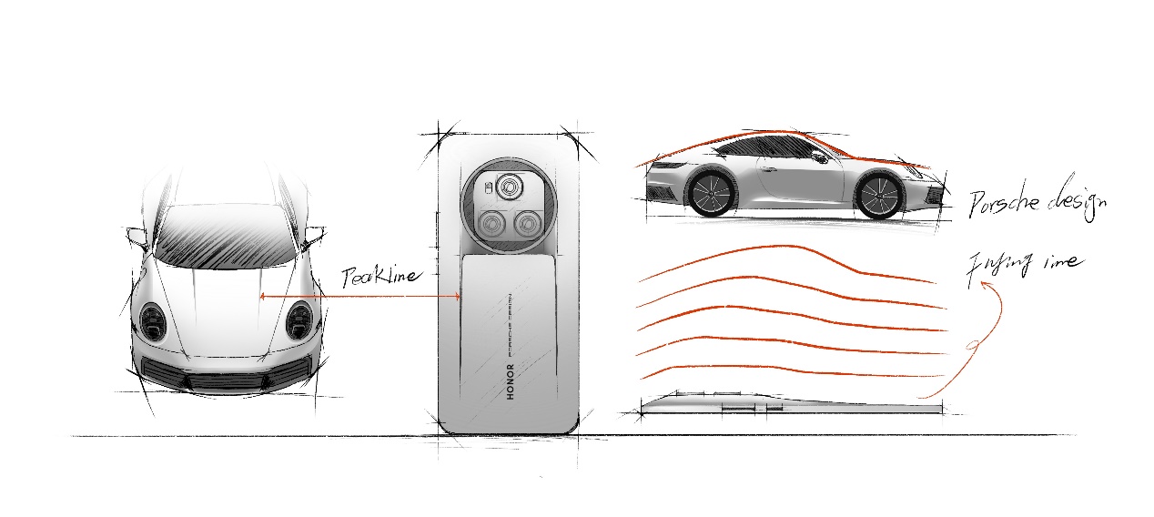 荣耀官方宣布与保时捷合作设计后,有博主爆料分享了一张荣耀Magic6保时捷版的设计师手稿图。从手稿中可以看到,荣耀新机的背部融入了保时捷911跑车的线条,荣耀和保时捷的设计logo呈竖向排列