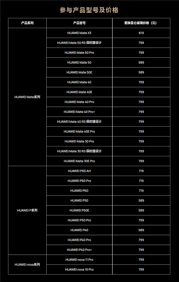 据了解,这一活动将于2023年12月31日结束,因此有需要的用户应该抓紧时间。华为官方公布的机型列表包括Mate X3、Mate 40、Mate 30、P60、P50、nova 11系列等多款机型,最高价格为799元。