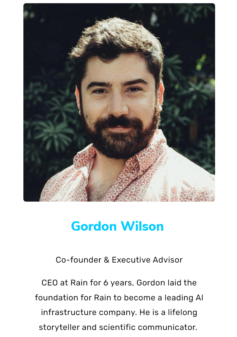 联合创始人兼执行顾问 Gordon Wilson 介绍显示,曾担任六年时间 CEO ,「为 Rain 成为一家领先的人工智能基础设施公司奠定了基础。」