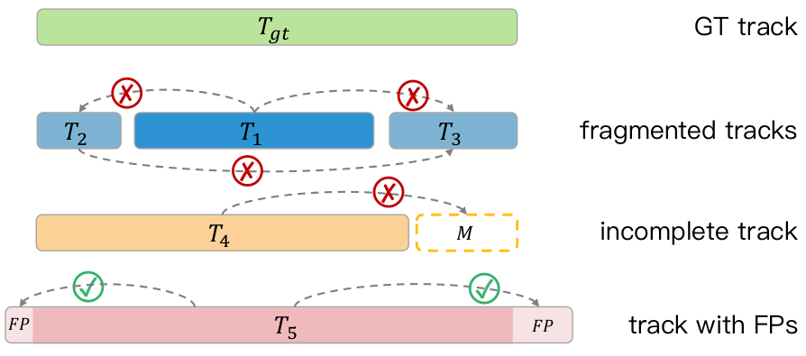 - 目前的目标检测和跟踪算法主要关注边界框层面(box-level)的性能指标,将在线的3D检测算法经过TTA和多模型融合之后所产生的大量冗余框作为跟踪算法的输入,通常很容易引发严重的轨迹分段、ID切换以及错误关联等问题,无法保证连续、完整的物体序列的生成,进而妨碍利用物体对应的长时序点云特征。如下图所示,原本一个物体的轨迹被分割成多个子序列(T1, T2, T3),导致拥有更多信息的T1片段的特征无法共享到T2和T3中;T4片段中经过优化的框也无法召回已经丢失掉的片段;T5片段中经过优化的框在转移到原先是FP的位置后依然是FP。
