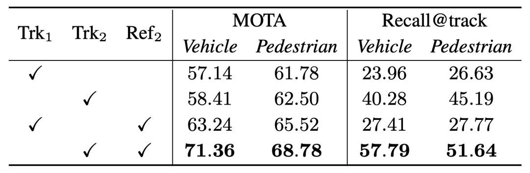 我们的离线追踪器更注重物体序列的完整性,虽然两者的MOTA性能差异很小,但是Recall@track的性能却是导致最终优化性能差异很大的一个原因