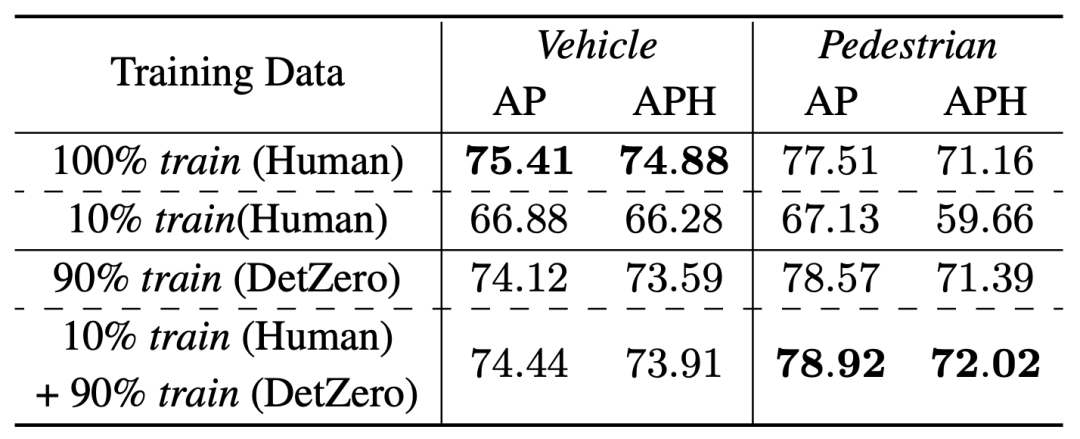 为了验证高质量的自动标注结果是否能够替代人工标注结果进行在线模型训练,我们在Waymo验证集上进行了半监督学习的验证。我们从训练数据中随机选择了10%作为老师模型(DetZero)的训练数据,并对剩下的90%数据进行推理,得到了自动标注的结果,这些结果将作为学生模型的标签。我们选择了单帧CenterPoint作为学生模型。在车辆类别上,使用90%的自动标签和10%的真值标签进行训练的结果接近于使用100%真值标签训练的结果,而在行人类别上,自动标签训练的模型结果已经优于原始结果,这表明自动标签可以用于在线模型训练