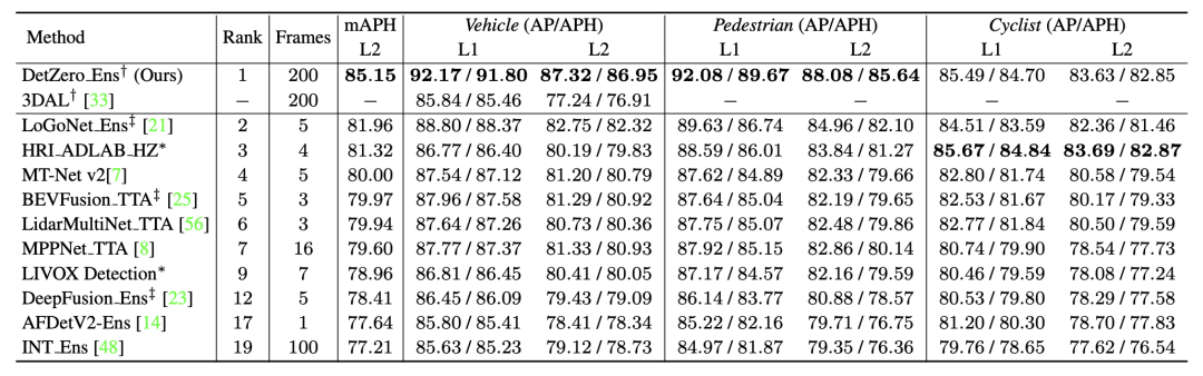 Waymo 3D检测排行榜结果,所有结果均使用TTA或ensemble技术,†指离线模型,‡指点云图像融合模型,*表示匿名提交结果