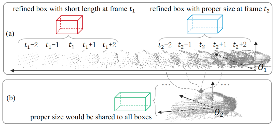 - 基于运动状态分类的优化模型没有充分利用到物体的时序特征。例如,刚性物体的尺寸大小随时间保持一致,通过从不同角度捕捉数据可以实现更准确的尺寸估计;物体的运动轨迹应当遵循一定的运动学约束,表现为轨迹的平滑性。如下图(a)所示,对于动态物体来说,基于滑动窗口的优化机制未考虑物体几何形状的一致性,仅通过邻近几帧的时序点云信息对边界框进行更新,导致预测的几何尺寸出现偏差。而在(b)的例子中,通过把该物体的点云全部聚合在一起,可获得稠密的时序点云特征,为每一帧都预测出边界框的准确的几何尺寸。