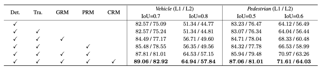 为了更好地验证我们提出的每个模块的作用,我们在Waymo验证集上进行了消融实验,并且采用了更严格的IoU阈值作为衡量标准