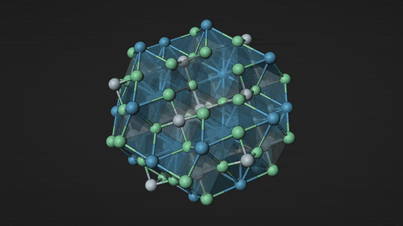 图|化合物 Ba₆Nb₇O₂₁ 是 GNoME 计算出的新材料之一,包含钡(蓝色)、铌(白色)和氧(绿色)。