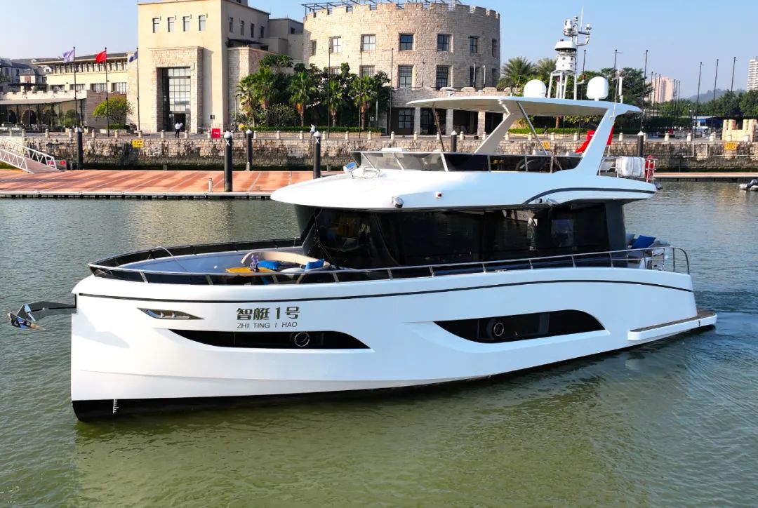 在新技术、新材料应用方面,“智艇 1 号”采用中国船舶集团旗下科研院所自主开发生产的碳纤维材质飞桥顶和自主开发的减摇陀螺,配备两台 441 千瓦的高速主机、两台 15 千瓦的轴带发电机、一台 17.5 千瓦的柴油发电机,并特别配备了一套由中国船舶集团旗下科研院所自主研发的 50 千瓦时锂电池和岸电接口混合动力系统。