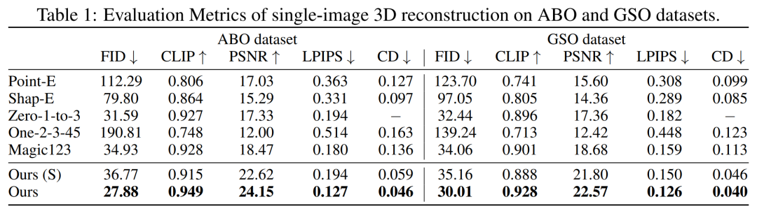 GSO和ABO测试集上的定量结果如下表1所示。研究者的模型优于所有基线方法,并且在这两个数据集上实现了所有指标的新SOTA