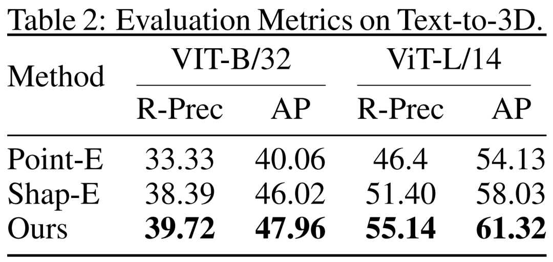 重新写作如下:研究人员还对基于文本的3D生成结果进行了DMV3D的评估。研究人员对比了DMV3D与同样支持全类别快速推理的Shap-E和Point-E。研究人员让这三个模型根据Shap-E的50个文本提示进行生成,并使用两个不同的ViT模型的CLIP准确度和平均准确度来评估生成结果,如表2所示