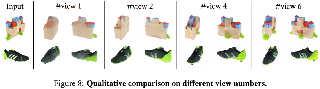 在视角方面,研究者在表 3 和图 8 中显示了用不同数量(1、2、4、6)的输入视图训练的模型的定量和定性比较。