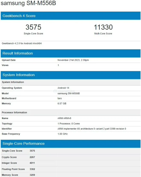 11月22日消息,最新曝光的 GeekBench 跑分数据显示,三星即将推出的 Galaxy M55 5G 手机,型号为 SM-M556B,在最新的 4.2.0 版本中取得了引人注目的性能表现。单核得分达到了3575分,多核表现更是高达11330分。