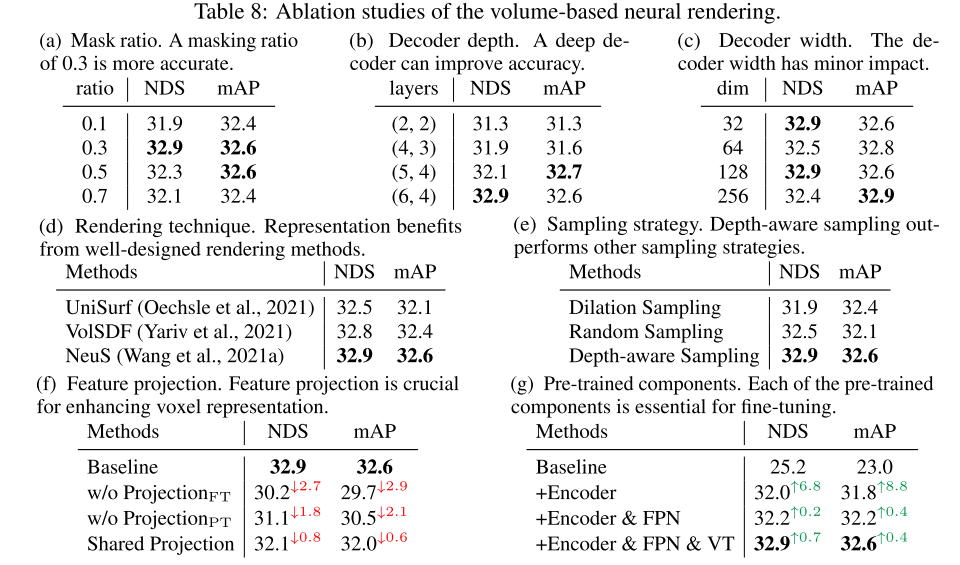 本文提出了一种专为有效 3D 表示学习而定制的新颖的预训练范式,它不仅避免了复杂的正/负样本分配,而且还隐式提供了连续的监督信号来学习 3D 形状结构。如图 2 所示,整个框架将 masked点云作为输入,旨在通过 3D 可微神经渲染在投影的 2D 深度图像上重建缺失的几何形状。具体来说,当提供masked LiDAR 点云时,本文的方法采用 3D 编码器来提取分层特征。然后,通过体素化将 3D 特征转换到体素空间。本文进一步应用可微分体积渲染方法来重建完整的几何表示。本文方法的灵活性有助于其与预训练 2D backbone的无缝集成。多视图图像特征通过 lift-split-shoot (LSS) 构建 3D volume(Philion & Fidler,2020)。为了保持训练阶段的效率,本文提出了一种专为自动驾驶应用设计的节省内存的光线采样(ray sampling)策略,其可以大大降低训练成本和内存消耗。与传统方法相比,新颖的采样策略显着提高了准确性。