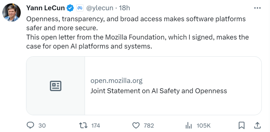 LeCun 表示,「开放、透明和广泛的访问使软件平台更安全、更可靠。这封来自 Mozilla 基金会的公开信,我也签了名,它为开放的人工智能平台和系统提供了理由。」