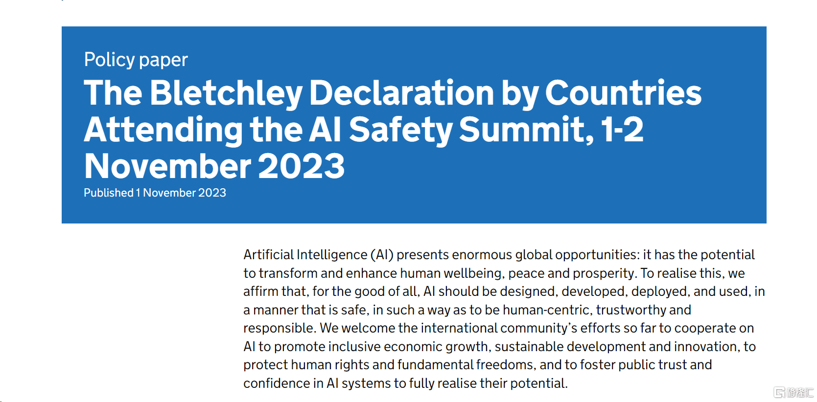 此前一天,在这场人工智能安全峰会上,英国政府公布了《布莱切利宣言》。