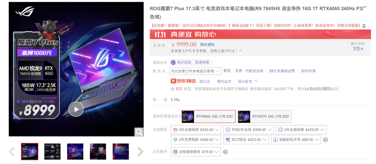 10 月 31 日晚 8 点,ROG 魔霸 7 Plus 到手价 8999 元,还有晒单返 50E 卡,感兴趣的同学可点击下方链接入手。