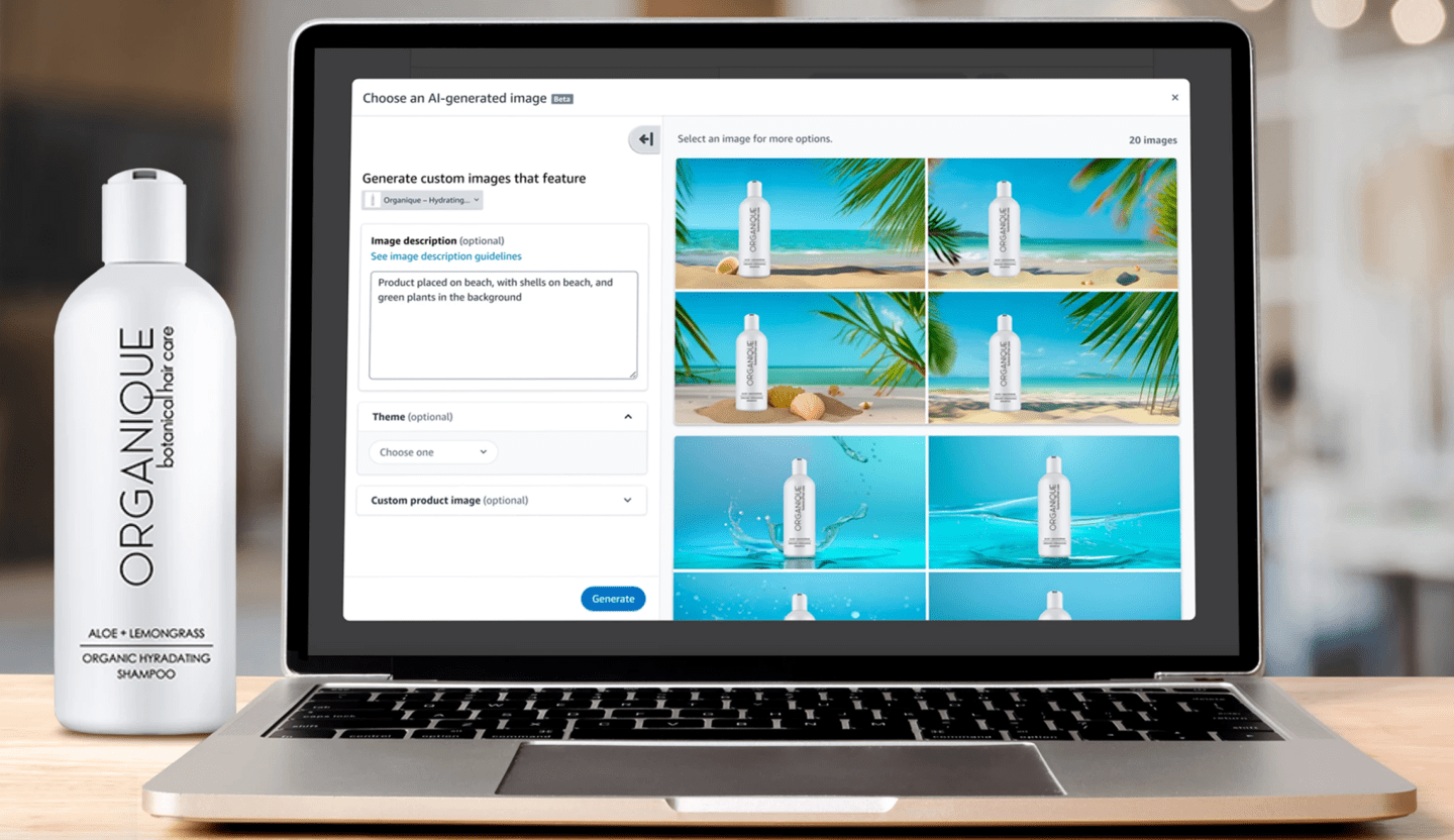 通过查询得知,IT之家发现,在Amazon Ad控制台中,卖家只需先选择产品主体,然后点击生成,该AI工具就会生成一组“带有生活风格”的图像。同时,该工具还可以根据输入的文字提示来调整图像内容