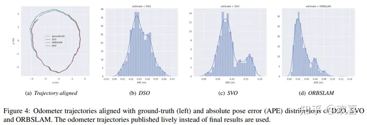 图4展示了里程计轨迹的评估结果。如图所示,SVO速度较快,但漂移较大,而ORBSLAM在绝对姿态误差(APE)方面达到了最高的精度。由于综合评估是一个可插拔的插件应用程序,可以重新实施更多的评估指标,例如点云的精度。