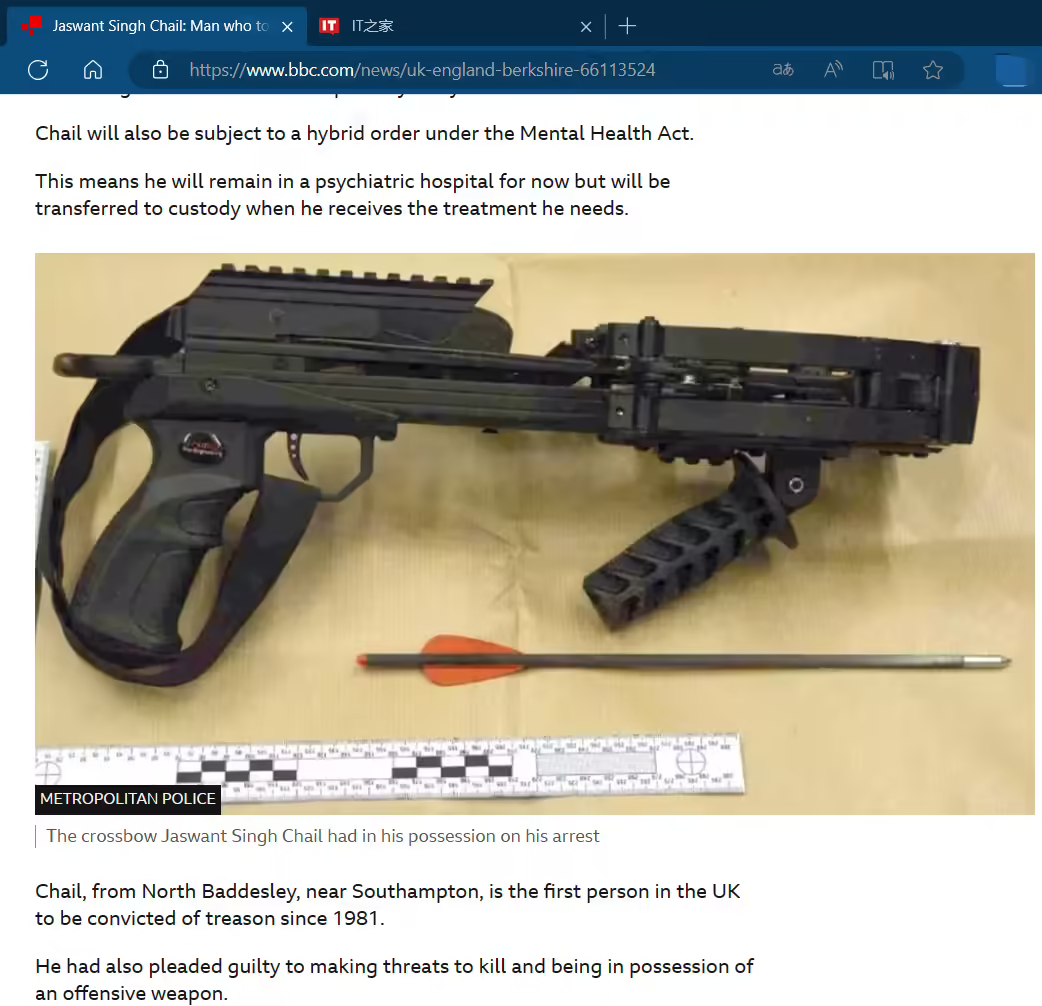 10 月 9 日消息,据英国 BBC 报道,2021 年圣诞节,一名手持弩枪的男子计划暗杀英国女王,在温莎城堡被捕,如今他因叛国罪被判入狱九年。