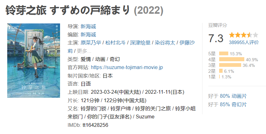 本站注意到,《铃芽之旅》于去年 11 月 11 日在日本上映,今年 3 月份内地上映。截至发稿,《铃芽之旅》豆瓣评分 7.3 分,其中 4、5 星评价占 56.2%。