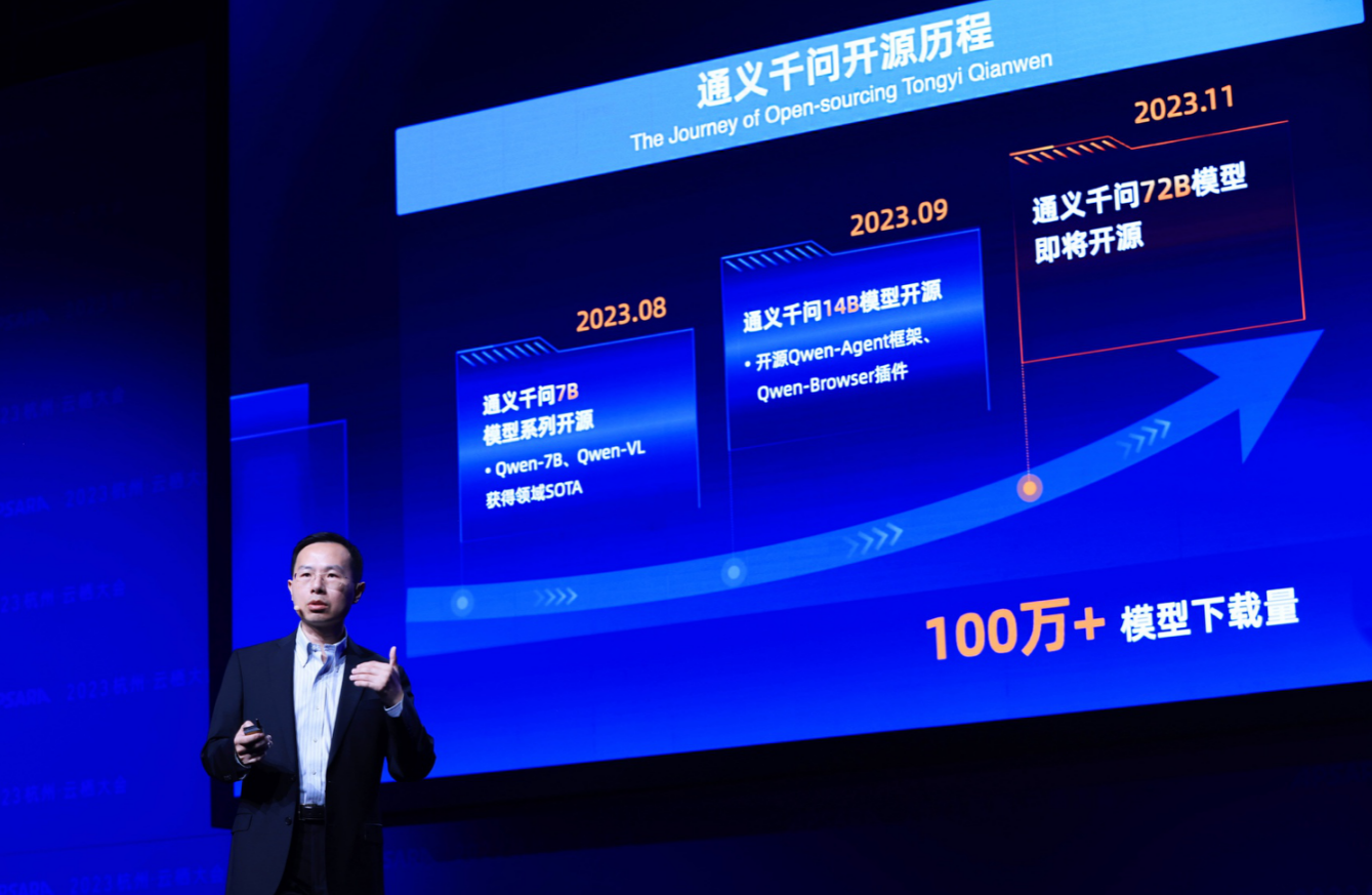 周靖人表示,阿里云计划在不久的将来开源通义千问的72B版本。此前,阿里云已经先后开源了7B和14B版本的模型,这些模型的累计下载量已经超过100万。阿里云将继续支持各行业的开发者利用通义千问开源模型进行模型和应用的创新