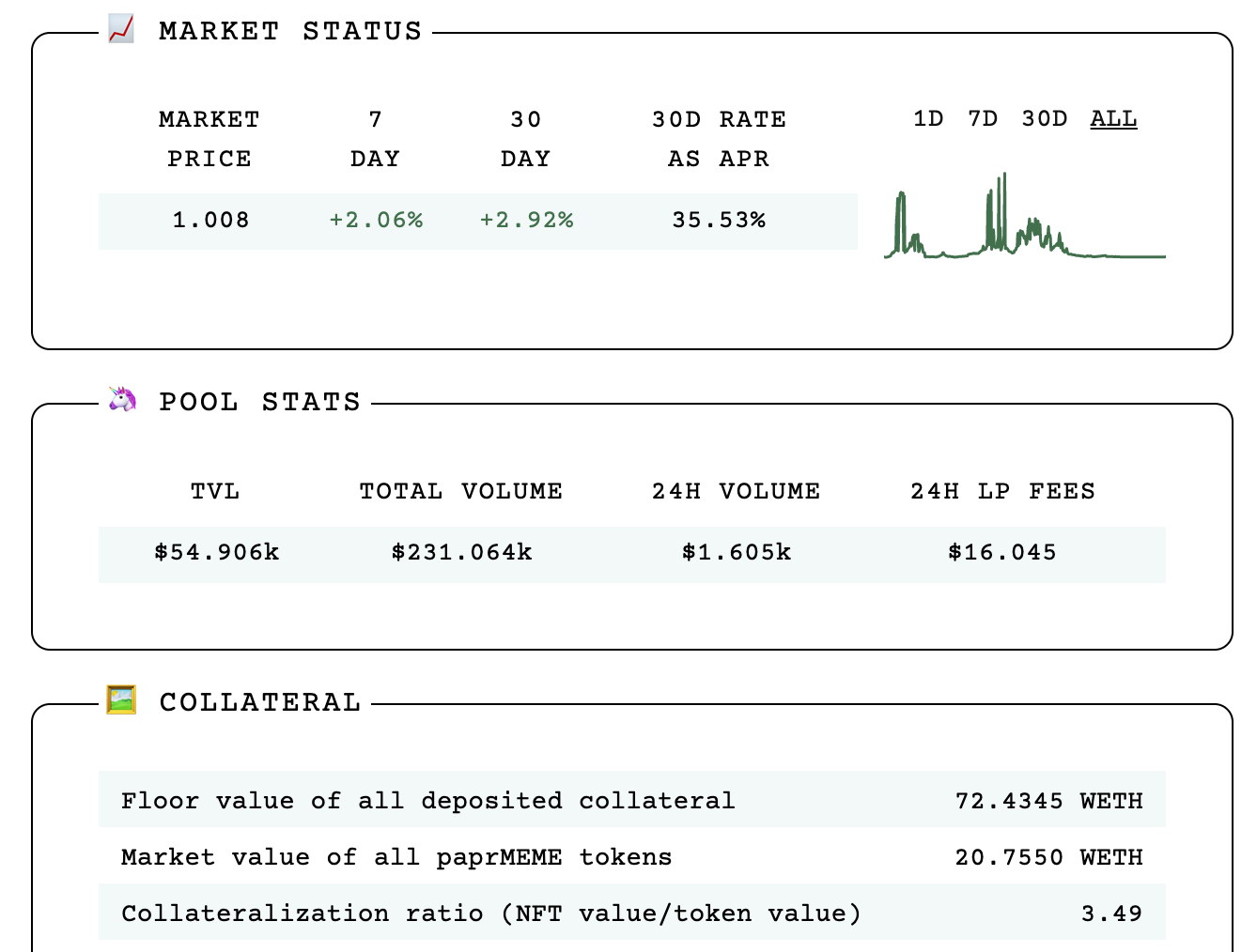 截至2月22日,所有抵押品的地板价之和为72.43 WETH;产生的债务之和,也就是$paprMEME的市值为20.75 WETH,抵押率为3.49。Uniswap V3上$paprMEME流动性池的TVL为5.49万美元,历史总交易量23万美元,过去24小时交易量1605美元。