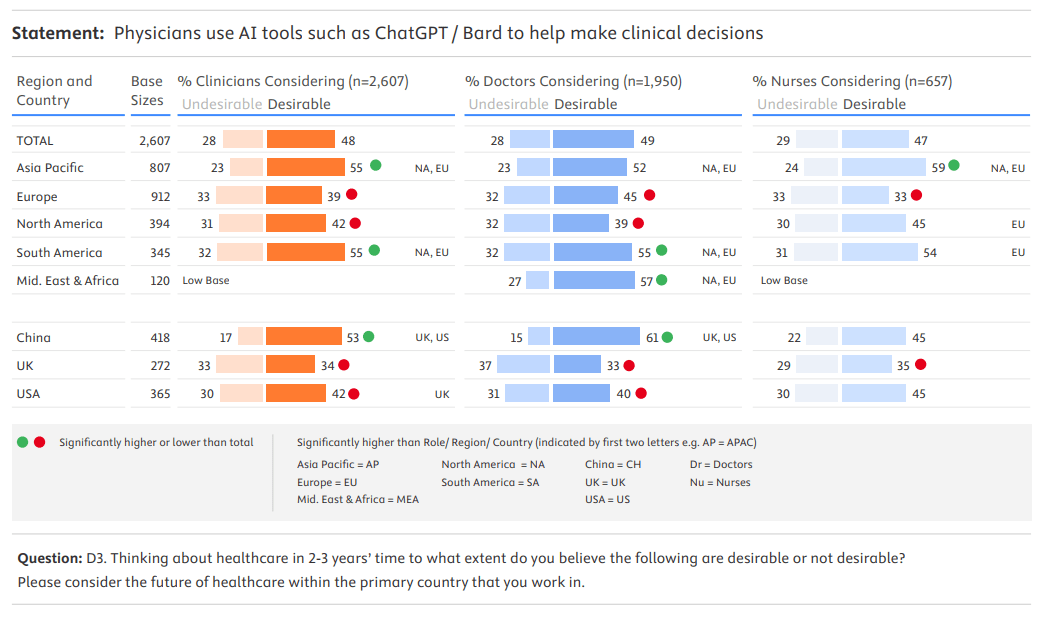 中国医护人员对人工智能生成技术持有更为乐观的态度。根据调查,53%的中国临床医生认为,在未来2到3年内,人工智能生成技术有望在医疗工作中得到更广泛的应用。这一比例高于美国的42%和英国的34%