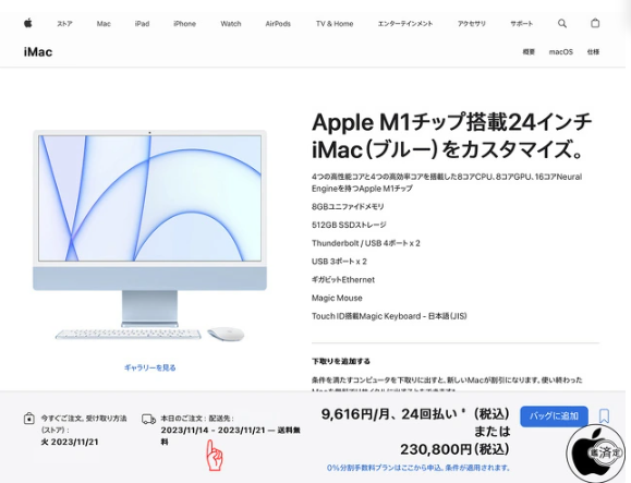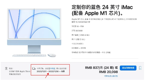 进一步访问苹果中国官网,选择了一款24英寸iMac,配置了16GB内存、2TB固态硬盘,并搭配了妙控鼠标和妙控板,发货日期显示为2023年11月1日至8日。