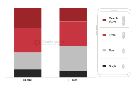 与此同时,2023年上半年,每部智能手机的平均摄像头数量也略有下降,从2022年下半年的3.9个减至3.8个。后置摄像头方面,配备双摄和三摄方案的智能手机的市场份额持续增长,逐渐挤占了配备四摄方案的手机市场份额。特别中国的安卓OEM厂商一直在积极减少摄像头数量,以节省成本或者腾出更多空间。相机、处理单元和算法的融合已经成为提升整体相机性能和图像质量的核心。