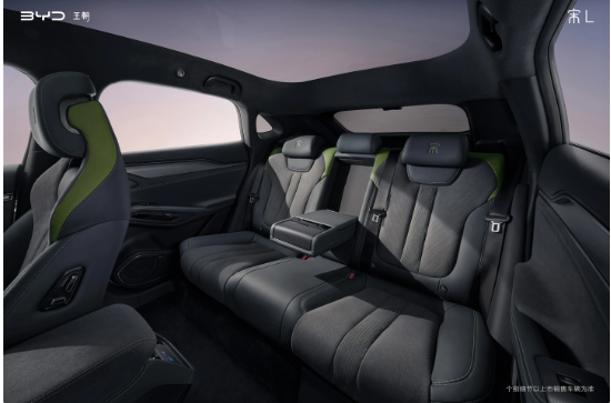 根据官图展示,宋 L 四驱版内饰采用了深灰色与荧光绿的巧妙搭配,座椅、门板以及中控台等部位都采用了麂皮材质,大幅提升了内饰的品质感和乘坐的舒适度。此外,座椅还配备了电动大腿腿托和电动按摩功能,进一步提高了驾乘体验的舒适性。