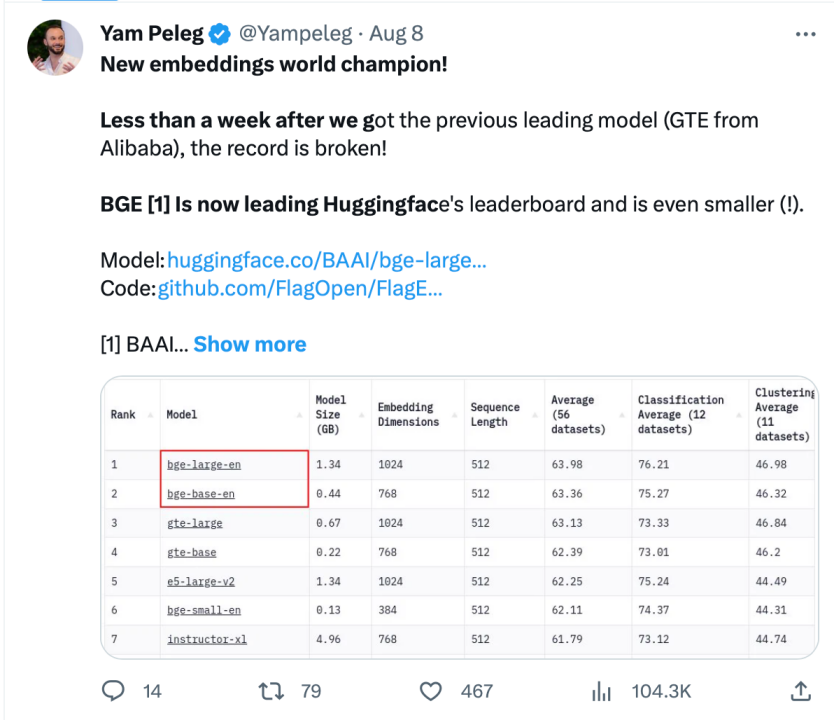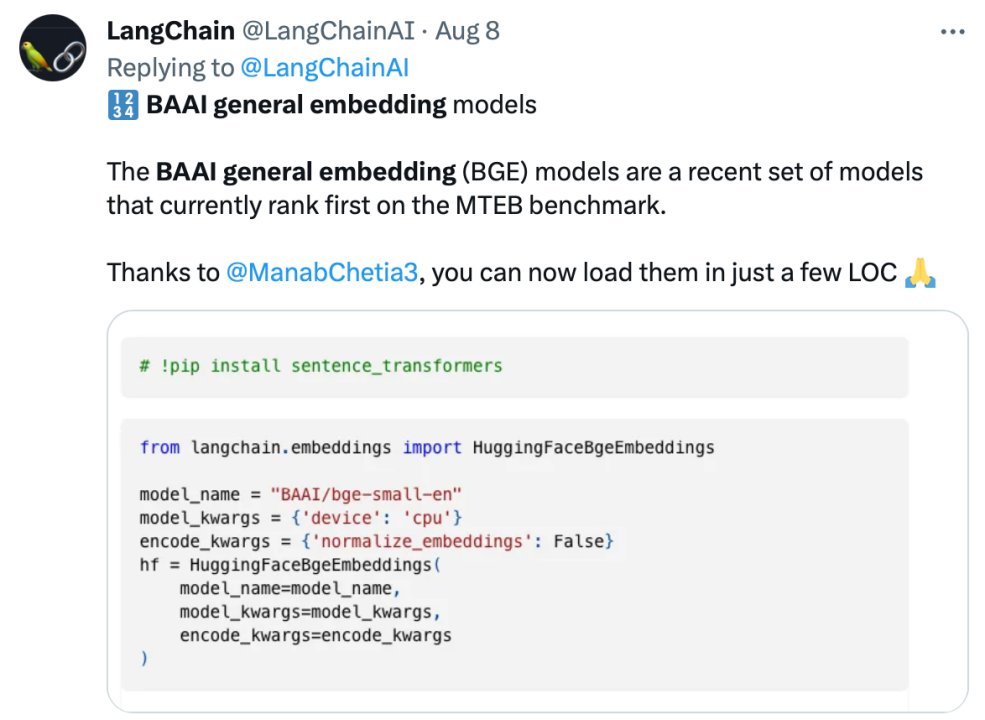 Langchain 官方、LangChain 联合创始人兼首席执行官 Harrison Chase、Deep trading 创始人 Yam Peleg 等社区大 V 对 BGE 表示关注。