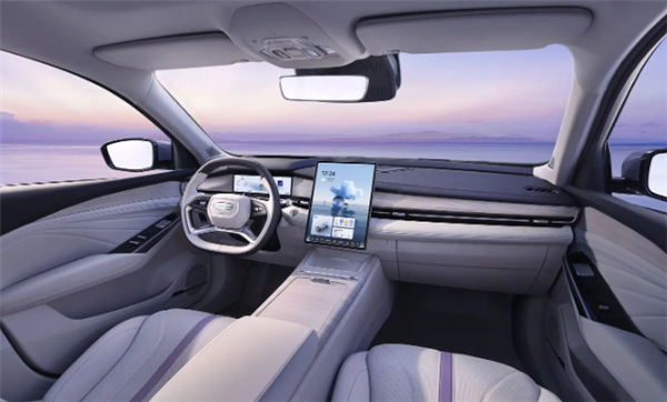 重新写成:在内饰方面,全新的星瑞L双擎版首次采用了紫色和白色的搭配,创造出更独特的氛围。方向盘也经过重新设计,操作方式变为怀挡,进一步提高了驾驶的便利性。部分实体按键被取消,取而代之的是集成在中控大屏幕中的空调等控制功能。中控屏幕并没有与岛台连接,而是在下方预留了手机储物槽,预计将支持无线充电,并配置有散热通风口。车内的材质也进行了升级,木纹装饰和大面积的软性材质包裹,以及黑白配色,进一步提升了车内的豪华感