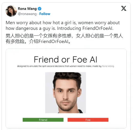 IT之家查询相关资料时,SmashorPassAI 网站也引起了女性开发者的不满,麻省理工学院数学和计算机科学专业的学生 Rona Wang(女性)开发了“FriendorFoeAI”网站,和 SmashorPassAI 网站类似,可以判断男性是“朋友”还是“渣男”。