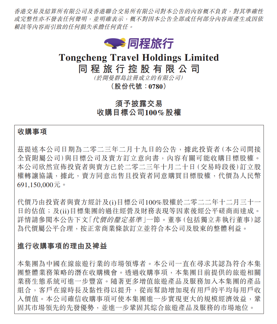本站 10 月 23 日消息,同程旅行发布公告称,已就收购同程旅业(前身万达旅业)100% 股权事宜完成协议签署,耗资人民币 691150000 元。