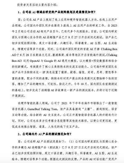 汤姆猫向投资者介绍了公司在AI领域在研发的产品矩阵规划及进展情况。公司在AI产品上规划了线上应用和硬件智能机器人方向。在线上应用产品领域,公司国内外团队同步在推进3款线上AI应用产品的研发工作,自2023年2月起公司启动AI相关产品至今,已迭代多个内测版本。目前,公司国内研发团队与西湖心辰合作的AI汤姆猫产品已于8月27日开启封闭式测试,该产品已初步实现拍照识物、英文口语启蒙、兴趣引导、科普教育、AI生图、AI生成绘本、情境对话等多个功能。同时,公司海外团队研发的首款AI手游《Talking Ben AI》于8月28日在斯洛文尼亚、塞浦路斯、南非等地区开启首轮海外测试。《Talking Ben AI》运用OpenAI与Google的AI通用大模型,以大模型 预设数据库相结合的创新模式,有效提升了核心主角狗狗本的交流互动能力。公司海外研发团队在该产品中为狗狗本这一IP角色设置了傲娇、疑惑、愉悦、好奇、思考、愤怒等丰富的表情,配合不同的表情,狗狗本针对用户提出的各类提问反馈独特个性的回答,增加了产品的趣味性、可玩性。除此之外,今年10月,国内团队在前期测试的基础上,初步完成了汤姆猫AI讲故事这一新产品的测试版本,并将计划于近期开展测试。