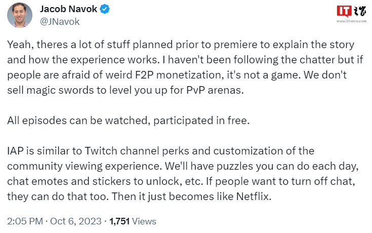 Jacob Navok 称,《寂静岭:飞升》不会包含内容选项,不会出售魔法剑让玩家去打 PVP。商店页面标注的“包含 IAP(应用内付费)”只是类似于 Twitch 的频道奖励和自定义物品。官方每天都会提供谜题、聊天表情和解锁贴纸等,玩家也可以关闭聊天,这样将更像在看 Netflix 网剧。