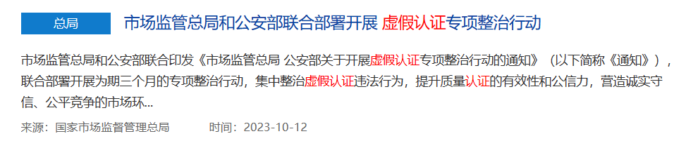本站 10 月 12 日消息,近日,市场监管总局和公安部联合印发《市场监管总局 公安部关于开展虚假认证专项整治行动的通知》(本站注:以下简称《通知》),联合部署开展为期三个月的专项整治行动,集中整治虚假认证违法行为,提升质量认证的有效性和公信力,营造诚实守信、公平竞争的市场环境,坚决维护国家安全和社会稳定。