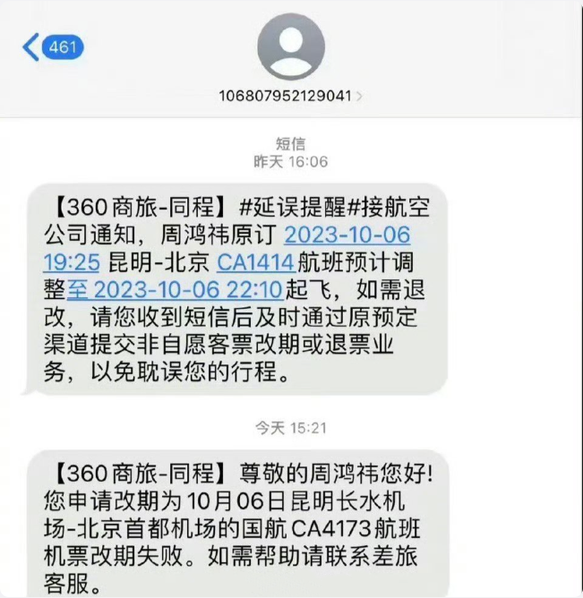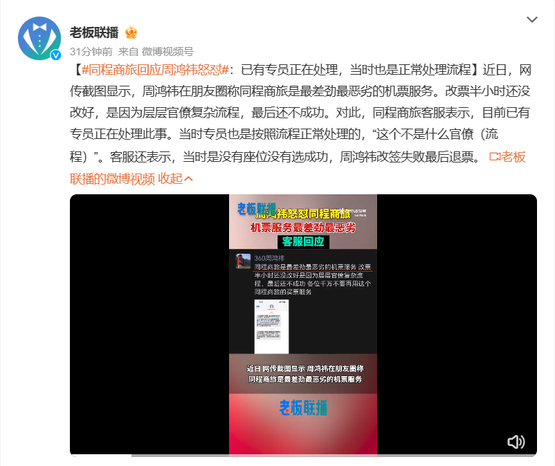 图源网 据老板联播报道,同程商旅客服表示非常重视,专员当时是按照流程正常处理的,不是什么官僚。客服还表示,当时是没有座位没有选成功,周鸿祎改签失败最后退票。