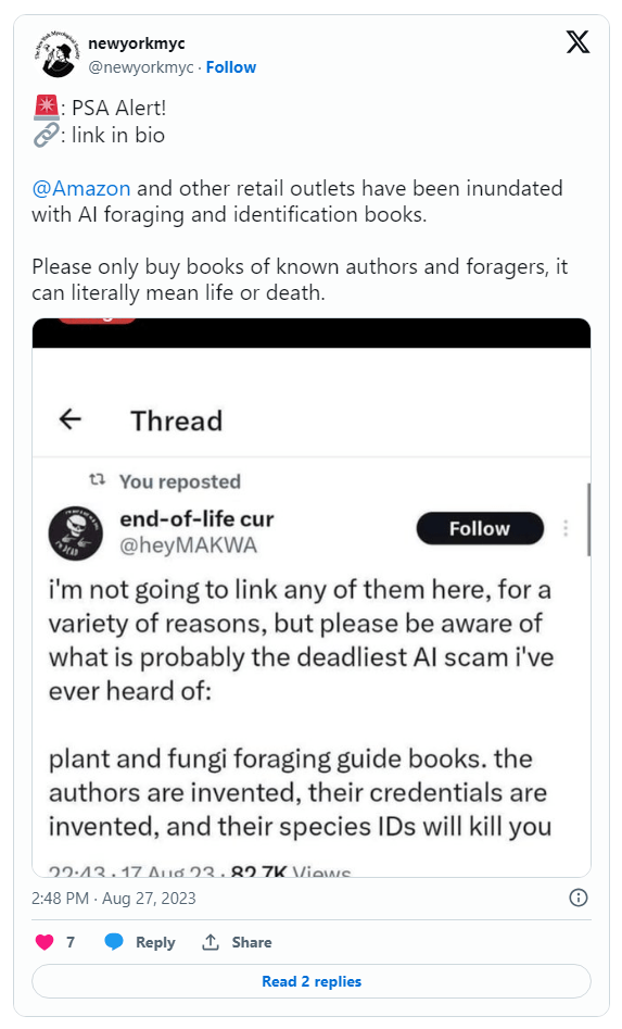 IT之家 8 月 30 日消息,非营利组织纽约真菌学会(NYMS)近日发出警告,表示亚马逊为代表的电商平台上,充斥着各种 AI 生成的蘑菇觅食科普书籍,其中存在诸多错误。如果某人在野外求生中,根据这些 AI 书籍的知识食用蘑菇,严重的可能会导致死亡。