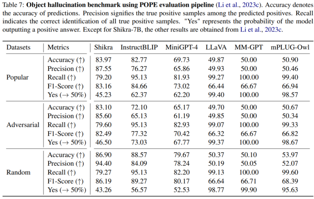 本文使用 POPE benchmark 评估了 Shikra 产生幻觉的程度。Shikra 得到了和 InstrcutBLIP 相当的结果,并远超近期其他 MLLM。