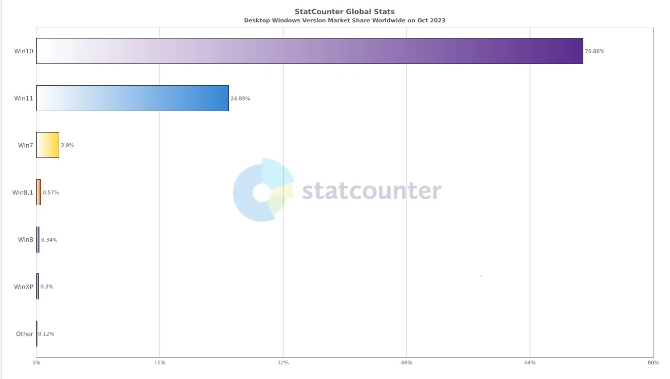 Statcounter的数据显示,截至2023年10月,Windows 10拥有最大的市场份额,占桌面电脑的约70.88%。Windows 11紧随其后,市场份额为24.89%。此外,Windows 7仍然占有约2.9%的市场份额。而Windows 8.1市场份额约为0.57%,Windows 8的市场份额约为0.34%,Windows XP市场份额约为0.3%。