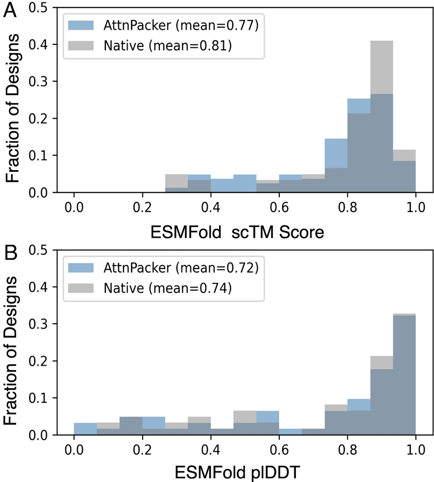 用 ESMFold scTM 和 plDDT 指标对比天然蛋白质序列和 AttnPacker 生成的序列,以评估 AttnPacker 的生成质量,结果表现出强相关性。