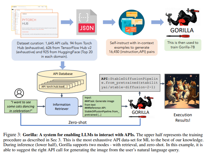 研究人员通过从公共模型中心刮取ML API(模型)来构建API Bench,这是一个具有复杂且经常重叠功能的大型API语料库。