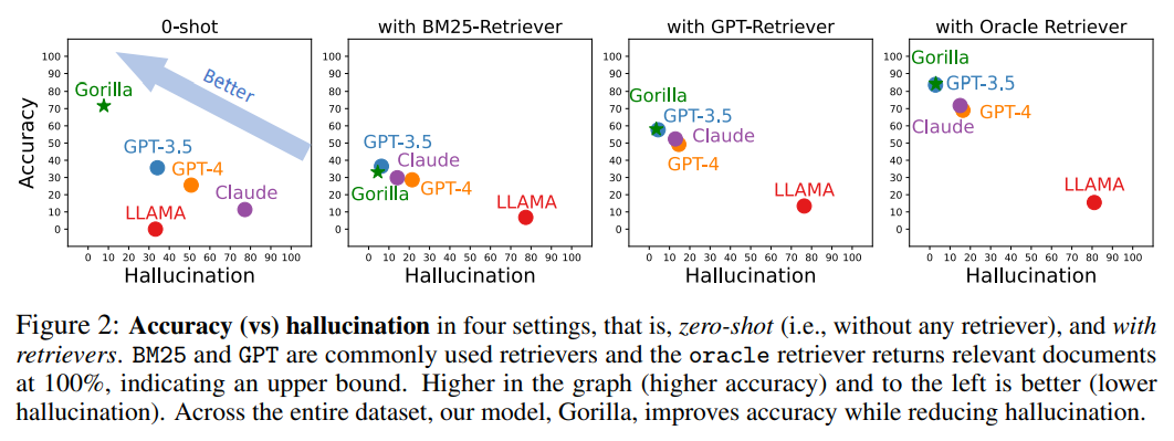 在整个数据集中,Gorilla在提高准确性的同时减少了幻觉。