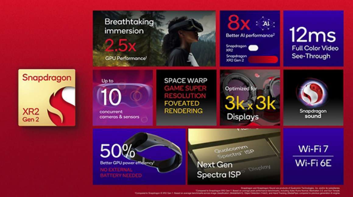 - GPU提供高达2.5倍的峰值性能,与骁龙XR2 Gen 1相比,功效提高了50%。