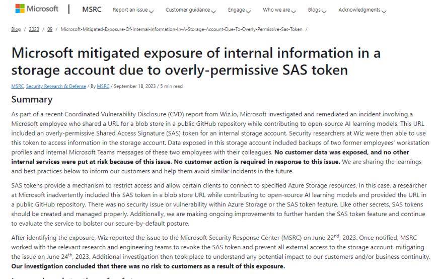 微软在周一发表的一篇博文中表示,公司已调查并补救了一起涉及一名微软员工的事件,该员工在公共GitHub存储库中向开源人工智能学习模型共享了一个URL。微软表示,存储账户中暴露的数据包括两名前员工工作站配置文件的备份,以及这两名前员工与同事的微软团队内部信息。