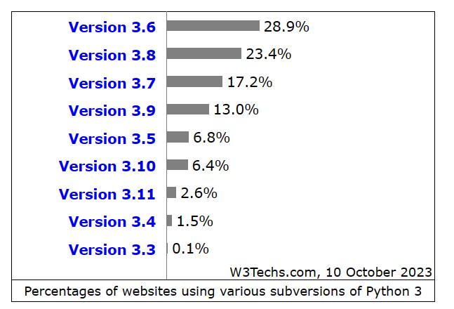 根据三方数据统计,在使用 Python 3.X 的网站当中,约有 17.2% 的人在使用 Python 3.7,而在 2021 年结束支持的 Python 3.6 仍然是最受欢迎的,占比达 28.9%;Python 3.8 位于两者之间,占 23.3%。